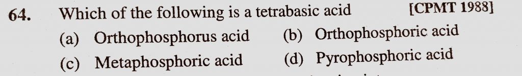 Which of the following is a tetrabasic acid (a) Orthophosphorus acid (b) Orthophosphoric acid (c) Metaphosphoric acid (d) Pyrophosphoric acid Which of the following is a tetrabasic acid (a) Orthophosphorus acid (b) Orthophosphoric acid (c) Metaphosphoric acid (d) Pyrophosphoric acid November 18, 2020 Category: Uncategorised (JEE Advanced Physics by BM Sharma + GMP Solutions) , Facebook Messenger WhatsApp Share this:TwitterFacebook Related