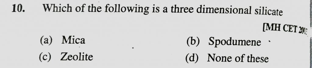 Which of the following is a three dimensional silicate (a) Mica (b) Spodumene (c) Zeolite (d) None of these Which of the following is a three dimensional silicate (a) Mica (b) Spodumene (c) Zeolite (d) None of these December 17, 2020 Category: Uncategorised (JEE Advanced Physics by BM Sharma + GMP Solutions) , Facebook Messenger WhatsApp Share this:TwitterFacebook Related