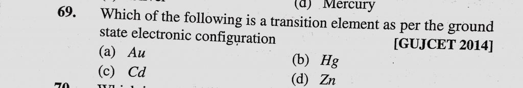 Which of the following is a transition element as per the ground state electronic configuration (a) Au (b) Hg (c) Cd (d) Zn Which of the following is a transition element as per the ground state electronic configuration (a) Au (b) Hg (c) Cd (d) Zn November 30, 2020 Category: Uncategorised (JEE Advanced Physics by BM Sharma + GMP Solutions) , Facebook Messenger WhatsApp Share this:TwitterFacebook Related