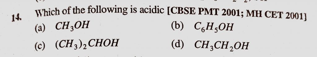 Which of the following is acidic (a) CH3OH (b) C6H5OH (c) (CH3)2CHOH (d) CH3CH2OH Which of the following is acidic (a) CH3OH (b) C6H5OH (c) (CH3)2CHOH (d) CH3CH2OH February 10, 2021 Category: Uncategorised (JEE Advanced Physics by BM Sharma + GMP Solutions) , Facebook Messenger WhatsApp Share this:TwitterFacebook Related