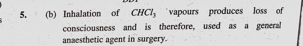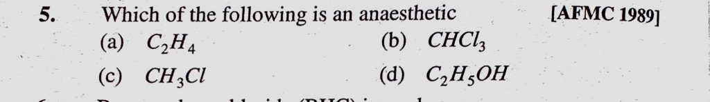 Which of the following is an anaesthetic (a) C2H4 (b) CHCl3 (c) CH3Cl (d) C2H5OH Which of the following is an anaesthetic (a) C2H4 (b) CHCl3 (c) CH3Cl (d) C2H5OH February 9, 2021 Category: Uncategorised (JEE Advanced Physics by BM Sharma + GMP Solutions) , Facebook Messenger WhatsApp Share this:TwitterFacebook Related
