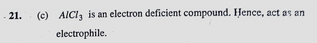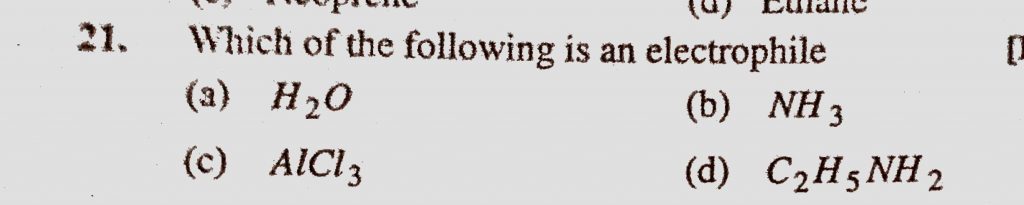 Which of the following is an electrophile (a) H2O (b) NH3 (c) AlCl3 (d) C2H5NH2 Which of the following is an electrophile (a) H2O (b) NH3 (c) AlCl3 (d) C2H5NH2 December 14, 2020 Category: Uncategorised (JEE Advanced Physics by BM Sharma + GMP Solutions) , Facebook Messenger WhatsApp Share this:TwitterFacebook Related