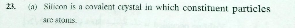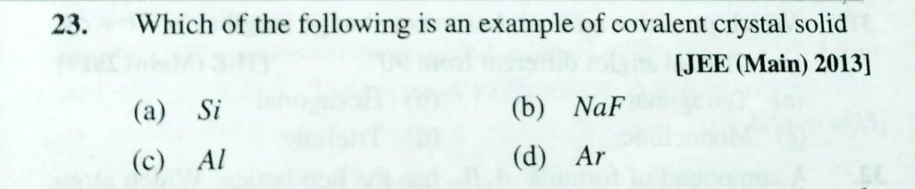 Which of the following is an example of covalent crystal solid (a) Si (b) NaF (c) Al (d) Ar Which of the following is an example of covalent crystal solid (a) Si (b) NaF (c) Al (d) Ar February 9, 2021 Category: Uncategorised (JEE Advanced Physics by BM Sharma + GMP Solutions) , Facebook Messenger WhatsApp Share this:TwitterFacebook Related