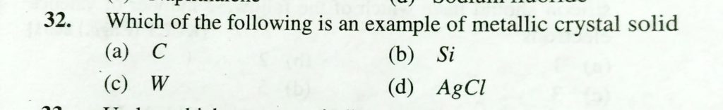 Which of the following is an example of metallic crystal solid (a) C (b) Si (c) W (d0 AgCl Which of the following is an example of metallic crystal solid (a) C (b) Si (c) W (d0 AgCl February 8, 2021 Category: Uncategorised (JEE Advanced Physics by BM Sharma + GMP Solutions) , Facebook Messenger WhatsApp Share this:TwitterFacebook Related