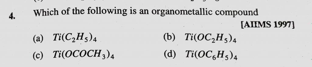 Which of the following is an organometallic compound (a) Ti(C2H5)4 (b) Ti(OC2H5)4 Which of the following is an organometallic compound (a) Ti(C2H5)4 (b) Ti(OC2H5)4 December 5, 2020 Category: Uncategorised (JEE Advanced Physics by BM Sharma + GMP Solutions) , Facebook Messenger WhatsApp Share this:TwitterFacebook Related