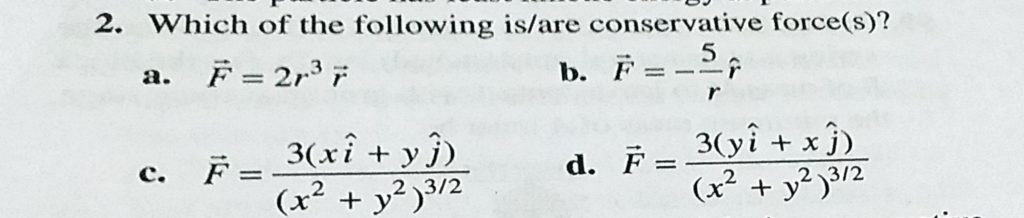 Which of the following is / are conservative forces (s) ? a. F = 2r^3 r b. F = -5/r r Which of the following is / are conservative forces (s) ? a. F = 2r^3 r b. F = -5/r r October 4, 2020 Category: Uncategorised (JEE Advanced Physics by BM Sharma + GMP Solutions) , Facebook Messenger WhatsApp Share this:TwitterFacebook Related