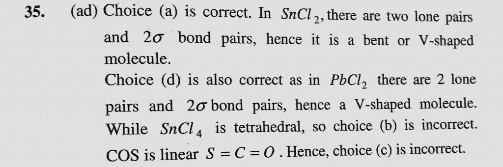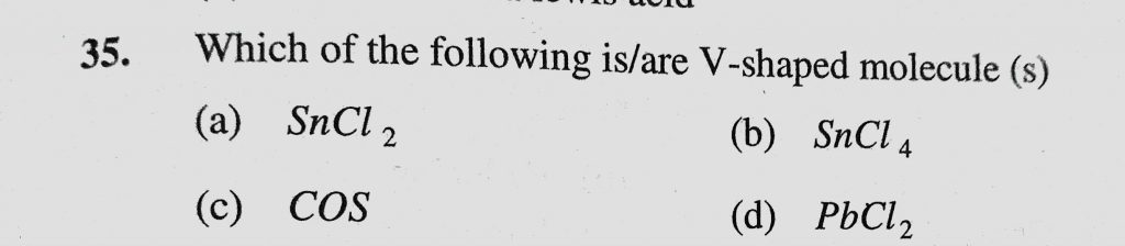 Which of the following is/are V-shaped molecule (s) (a) SnCl2 (b) SnCl4 (c) COS (d) PbCl2 Which of the following is/are V-shaped molecule (s) (a) SnCl2 (b) SnCl4 (c) COS (d) PbCl2 November 29, 2020 Category: Uncategorised (JEE Advanced Physics by BM Sharma + GMP Solutions) , Facebook Messenger WhatsApp Share this:TwitterFacebook Related
