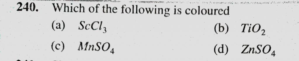 Which of the following is coloured (a) ScCl3 (b) TiO2 (c) MnSO4 (d) ZnSO4 Which of the following is coloured (a) ScCl3 (b) TiO2 (c) MnSO4 (d) ZnSO4 December 2, 2020 Category: Uncategorised (JEE Advanced Physics by BM Sharma + GMP Solutions) , Facebook Messenger WhatsApp Share this:TwitterFacebook Related