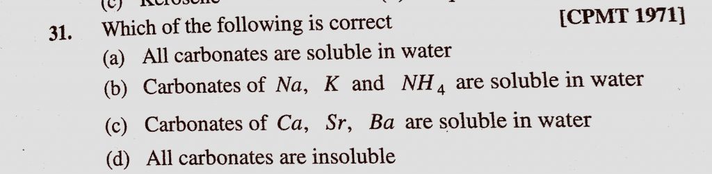 Which of the following is correct (a) All carbonates are soluble in water (b) Carbonates of Na, K and NH4 are soluble in water K and NH4 are soluble in water Which of the following is correct (a) All carbonates are soluble in water (b) Carbonates of Na November 13, 2020 Category: Uncategorised (JEE Advanced Physics by BM Sharma + GMP Solutions) , Facebook Messenger WhatsApp Share this:TwitterFacebook Related