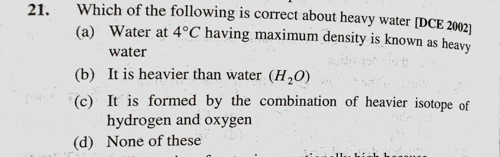 Which of the following is correct about heavy water (a) Water at 4 C having maximum density is known as heavy water (b) It is heavier than water (H20) Which of the following is correct about heavy water (a) Water at 4 C having maximum density is known as heavy water (b) It is heavier than water (H20) November 13, 2020 Category: Uncategorised (JEE Advanced Physics by BM Sharma + GMP Solutions) , Facebook Messenger WhatsApp Share this:TwitterFacebook Related