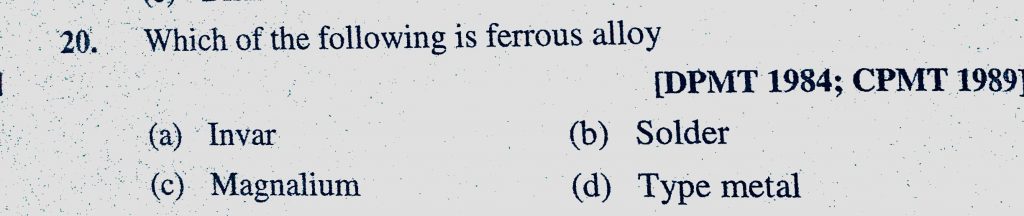 Which of the following is ferrous alloy (a) Invar (b) Solder (c) Magnalium (d) Type metal Which of the following is ferrous alloy (a) Invar (b) Solder (c) Magnalium (d) Type metal November 11, 2020 Category: Uncategorised (JEE Advanced Physics by BM Sharma + GMP Solutions) , Facebook Messenger WhatsApp Share this:TwitterFacebook Related