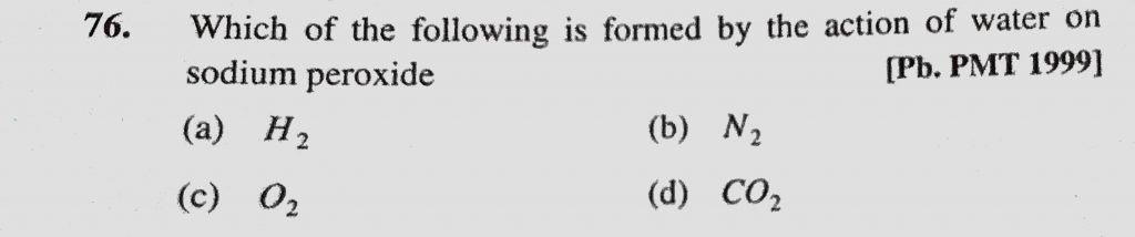 Which of the following is formed by the action of water on sodium peroxide (a) H2 (b) N2 (c) O2 (d) CO2 Which of the following is formed by the action of water on sodium peroxide (a) H2 (b) N2 (c) O2 (d) CO2 November 23, 2020 Category: Uncategorised (JEE Advanced Physics by BM Sharma + GMP Solutions) , Facebook Messenger WhatsApp Share this:TwitterFacebook Related