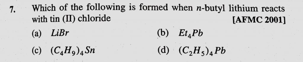 Which of the following is formed when n-butyl lithium reacts with tin (II) chloride (a) LiBr (b) Et4Pb Which of the following is formed when n-butyl lithium reacts with tin (II) chloride (a) LiBr (b) Et4Pb December 5, 2020 Category: Uncategorised (JEE Advanced Physics by BM Sharma + GMP Solutions) , Facebook Messenger WhatsApp Share this:TwitterFacebook Related