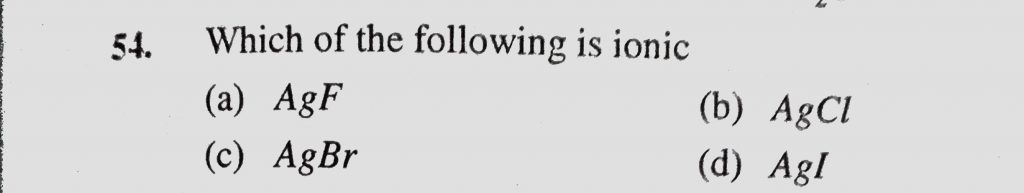 Which of the following is ionic (a) AgF (b) AgCl (c) AgBr (d) AgI Which of the following is ionic (a) AgF (b) AgCl (c) AgBr (d) AgI December 2, 2020 Category: Uncategorised (JEE Advanced Physics by BM Sharma + GMP Solutions) , Facebook Messenger WhatsApp Share this:TwitterFacebook Related