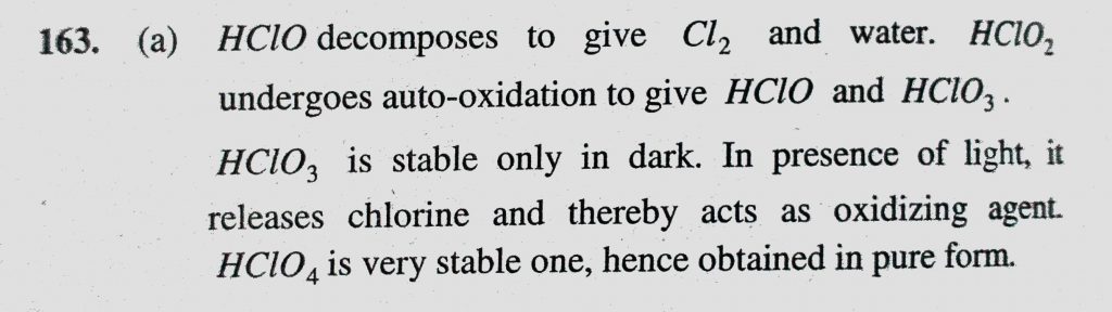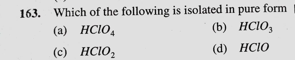 Which of the following is isolated in pure form (a) HClO4 (b) HClO3 (c) HClO2 (d) HClO Which of the following is isolated in pure form (a) HClO4 (b) HClO3 (c) HClO2 (d) HClO November 25, 2020 Category: Uncategorised (JEE Advanced Physics by BM Sharma + GMP Solutions) , Facebook Messenger WhatsApp Share this:TwitterFacebook Related