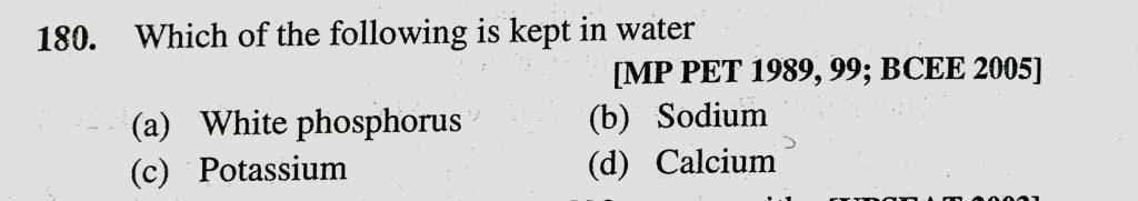 Which of the following is kept in water (a) White phosphorus (b) Sodium (c) Potassium (d) Calcium Which of the following is kept in water (a) White phosphorus (b) Sodium (c) Potassium (d) Calcium November 23, 2020 Category: Uncategorised (JEE Advanced Physics by BM Sharma + GMP Solutions) , Facebook Messenger WhatsApp Share this:TwitterFacebook Related