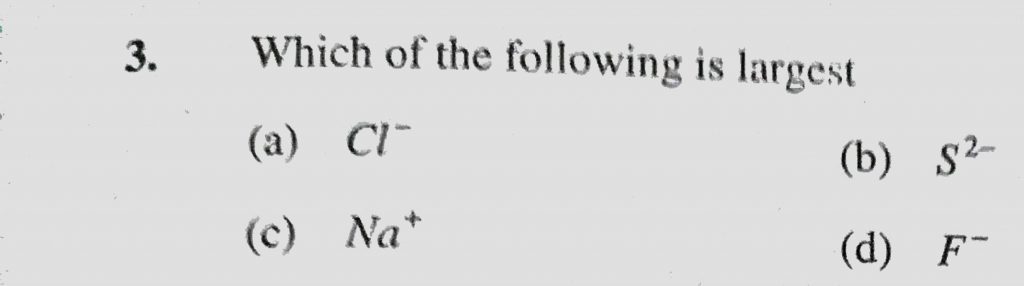 Which of the following is largest (a) Cl – (b) S 2- (c) Na + (d) F – Which of the following is largest (a) Cl - (b) S 2- (c) Na + (d) F - November 9, 2020 Category: Uncategorised (JEE Advanced Physics by BM Sharma + GMP Solutions) , Facebook Messenger WhatsApp Share this:TwitterFacebook Related