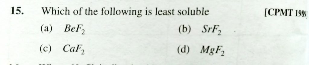 Which of the following is least soluble (a) BeF2 (b) SrF2 (c) CaF2 (d) MgF2 Which of the following is least soluble (a) BeF2 (b) SrF2 (c) CaF2 (d) MgF2 December 1, 2020 Category: Uncategorised (JEE Advanced Physics by BM Sharma + GMP Solutions) , Facebook Messenger WhatsApp Share this:TwitterFacebook Related