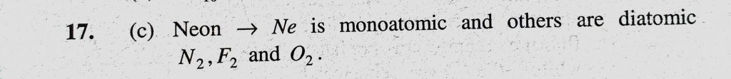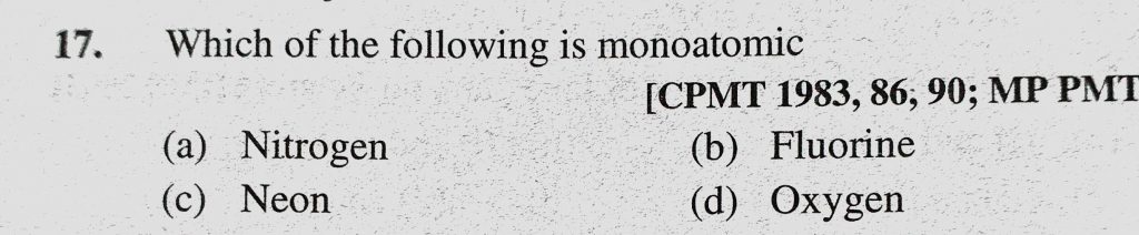 Which of the following is monoatomic (a) Nitrogen (b) Fluorine (c) Neon (d) Oxygen Which of the following is monoatomic (a) Nitrogen (b) Fluorine (c) Neon (d) Oxygen November 25, 2020 Category: Uncategorised (JEE Advanced Physics by BM Sharma + GMP Solutions) , Facebook Messenger WhatsApp Share this:TwitterFacebook Related
