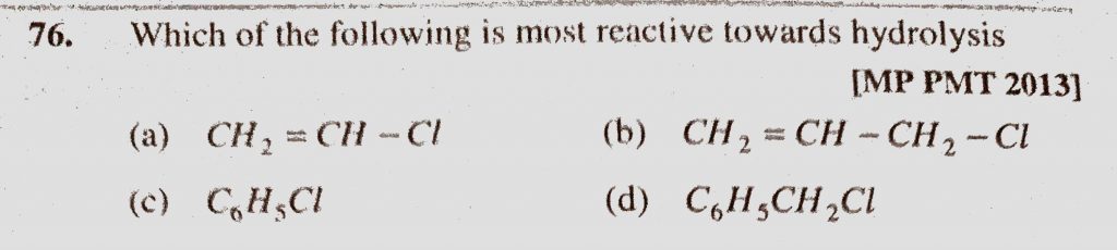 Which of the following is most reactive towards hydrolysis (a) CH2 = CH -Cl (b) CH2 = CH – CH2 – Cl (c) C6H5Cl (d) C6H5CH2Cl Which of the following is most reactive towards hydrolysis (a) CH2 = CH -Cl (b) CH2 = CH - CH2 - Cl (c) C6H5Cl (d) C6H5CH2Cl February 8, 2021 Category: Uncategorised (JEE Advanced Physics by BM Sharma + GMP Solutions) , Facebook Messenger WhatsApp Share this:TwitterFacebook Related