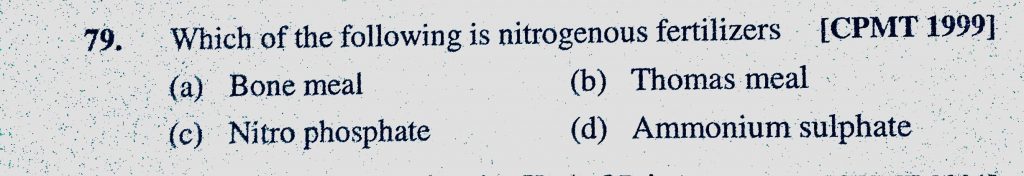 Which of the following is nitrogenous fertilizers (a) Bone meal (b) Thomas meal (c) Nitro phosphate (d) Ammonium sulphate Which of the following is nitrogenous fertilizers (a) Bone meal (b) Thomas meal (c) Nitro phosphate (d) Ammonium sulphate November 18, 2020 Category: Uncategorised (JEE Advanced Physics by BM Sharma + GMP Solutions) , Facebook Messenger WhatsApp Share this:TwitterFacebook Related