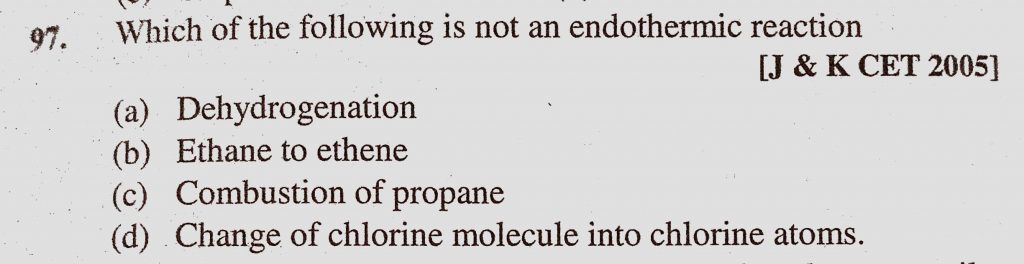 Which of the following is not an endothermic reaction (a) Dehydrogenation (b) Ethane to Ethene (c) Combustion of propane (d) Change of chlorine molecule into chlorine atoms. Which of the following is not an endothermic reaction (a) Dehydrogenation (b) Ethane to Ethene (c) Combustion of propane (d) Change of chlorine molecule into chlorine atoms. December 13, 2020 Category: Uncategorised (JEE Advanced Physics by BM Sharma + GMP Solutions) , Facebook Messenger WhatsApp Share this:TwitterFacebook Related