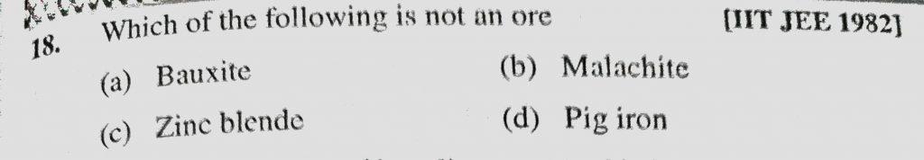 Which of the following is not an ore (a) Bauxite (b) Malachite (c) Zinc blende (d) Pig iron Which of the following is not an ore (a) Bauxite (b) Malachite (c) Zinc blende (d) Pig iron November 12, 2020 Category: Uncategorised (JEE Advanced Physics by BM Sharma + GMP Solutions) , Facebook Messenger WhatsApp Share this:TwitterFacebook Related