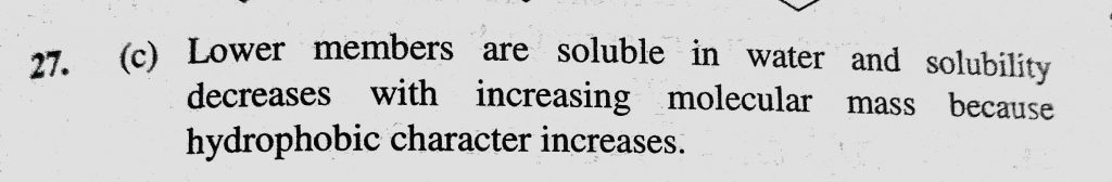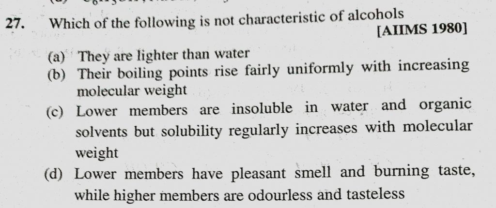 Which of the following is not characteristic of alcohols (a) They are lighter than water (b) Their boiling points rise fairly uniformly with increasing molecular weight (c) Lower members are insoluble Which of the following is not characteristic of alcohols (a) They are lighter than water (b) Their boiling points rise fairly uniformly with increasing molecular weight (c) Lower members are insoluble February 10, 2021 Category: Uncategorised (JEE Advanced Physics by BM Sharma + GMP Solutions) , Facebook Messenger WhatsApp Share this:TwitterFacebook Related