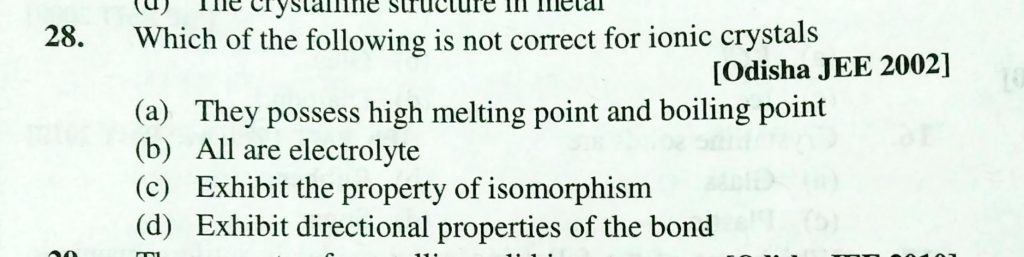 Which of the following is not correct for ionic crystals (a) They posses high meltingg point and boiling point (b) All are electrolyte (c) Exhibit the property of isomorphism (d) Exhibit directional properties of the bond Crystalline solids are (a) Glass (b) Rubber (c) Plastic (d) Sugar December 16, 2020 Category: Uncategorised (JEE Advanced Physics by BM Sharma + GMP Solutions) , Facebook Messenger WhatsApp Share this:TwitterFacebook Related