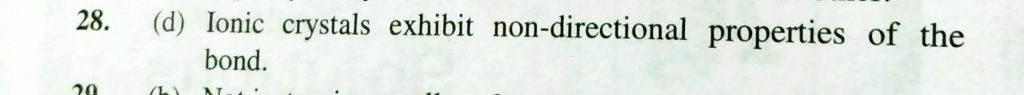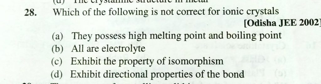 Which of the following is not correct for ionic crystals (a) They posses high melting and boiling point (b) All are electrolyte (c) Exhibit the property of isomorphism (d) Exhibt the directional properties of bond Among solids the highest melting point is established by (a) Covalent solids (b) Ionic solids (c) Pseudo solids (d) Molecular solids February 8, 2021 Category: Uncategorised (JEE Advanced Physics by BM Sharma + GMP Solutions) , Facebook Messenger WhatsApp Share this:TwitterFacebook Related