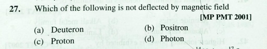 Which of the following is not deflected by magnetic field (a) Deutron (b) poistron (c) Proton (d) photon Which of the following does not contain material particles (a) Alpha rays (b) beta rays (c) Gamma rays (d) canal rays February 13, 2021 Category: Uncategorised (JEE Advanced Physics by BM Sharma + GMP Solutions) , Facebook Messenger WhatsApp Share this:TwitterFacebook Related