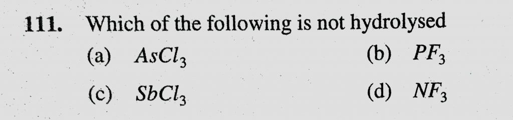 Which of the following is not hydrolysed (a) AsCl3 (b) PF3 (c) SbCl3 (d) NF3 Which of the following is not hydrolysed (a) AsCl3 (b) PF3 (c) SbCl3 (d) NF3 November 22, 2020 Category: Uncategorised (JEE Advanced Physics by BM Sharma + GMP Solutions) , Facebook Messenger WhatsApp Share this:TwitterFacebook Related