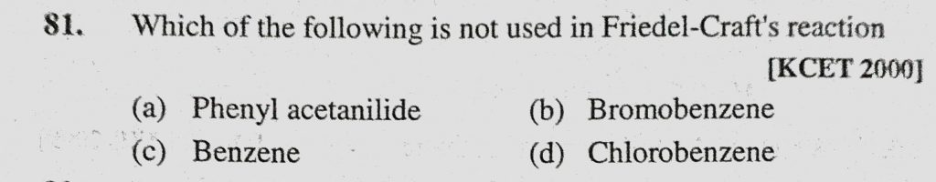 Which of the following is not in Friedel-Craft’s reaction (a) Phenyl acetanilide (b) Bromobenzene (c) Benzene (d) Chlorobenzene Which of the following is not in Friedel-Craft's reaction (a) Phenyl acetanilide (b) Bromobenzene (c) Benzene (d) Chlorobenzene December 15, 2020 Category: Uncategorised (JEE Advanced Physics by BM Sharma + GMP Solutions) , Facebook Messenger WhatsApp Share this:TwitterFacebook Related