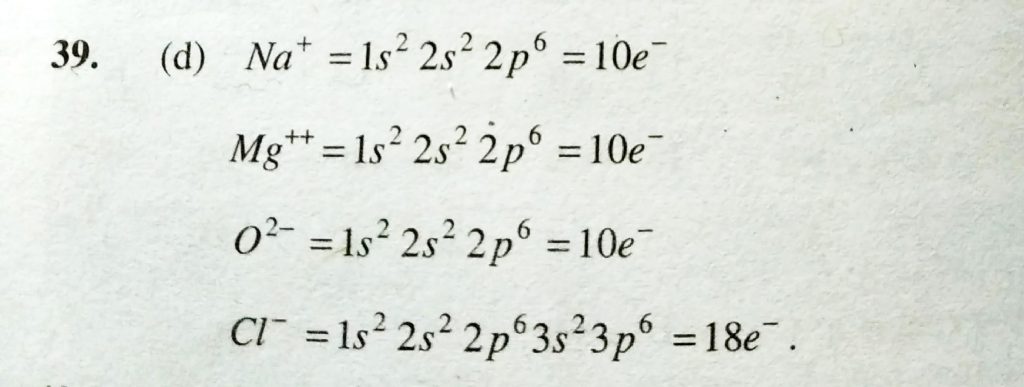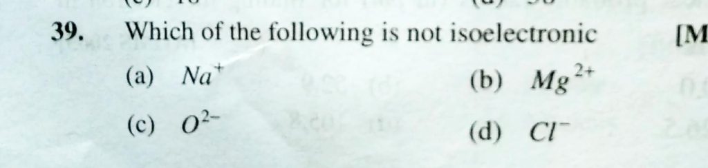 Which of the following is not isoelectronic (a) Na^+ (B) Mg^2+ (c) O^2- (d) Cl^- Which of the following is not isoelectronic (a) Na^+ (B) Mg^2+ (c) O^2- (d) Cl^- November 26, 2020 Category: Uncategorised (JEE Advanced Physics by BM Sharma + GMP Solutions) , Facebook Messenger WhatsApp Share this:TwitterFacebook Related