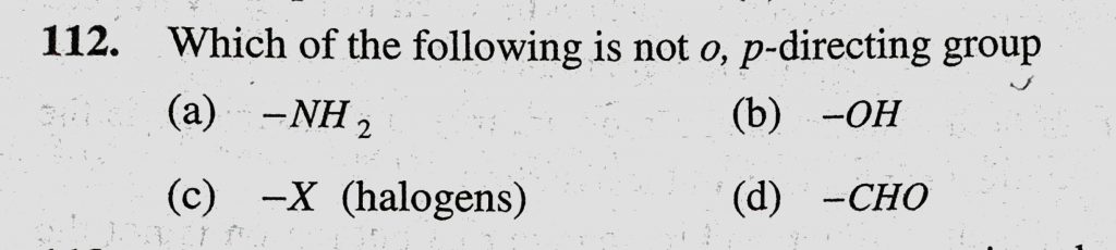 Which of the following is not o, p-directing group (a) -NH2 (b) -OH (c) -X (d) -CHO p-directing group (a) -NH2 (b) -OH (c) -X (d) -CHO Which of the following is not o December 15, 2020 Category: Uncategorised (JEE Advanced Physics by BM Sharma + GMP Solutions) , Facebook Messenger WhatsApp Share this:TwitterFacebook Related