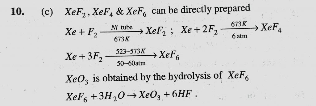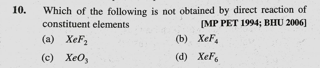 Which of the following is not obtained by direct reaction of constituent elements (a) XeF2 (b) XeF4 (c) XeO3 (d) XeF6 Which of the following is not obtained by direct reaction of constituent elements (a) XeF2 (b) XeF4 (c) XeO3 (d) XeF6 November 25, 2020 Category: Uncategorised (JEE Advanced Physics by BM Sharma + GMP Solutions) , Facebook Messenger WhatsApp Share this:TwitterFacebook Related