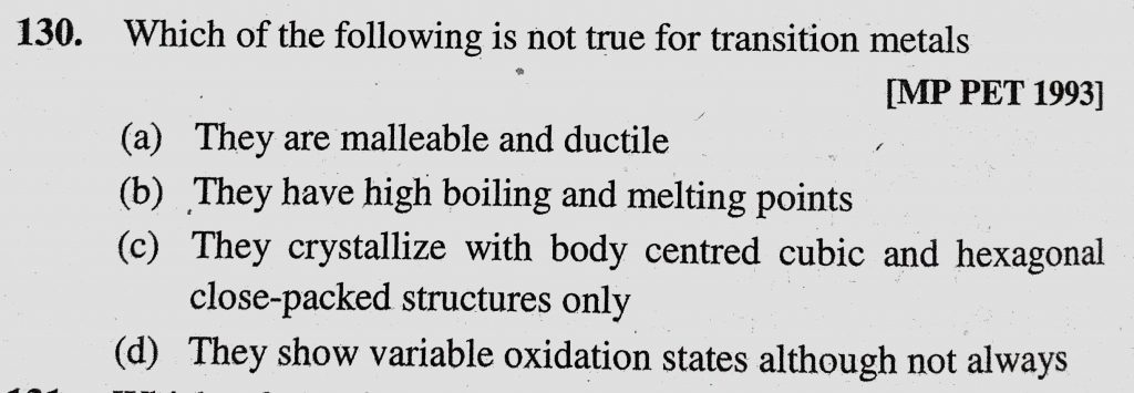 Which of the following is not true for transition metals (a) They are malleable and ductile (b) They have high boiling and melting point Which of the following is not true for transition metals (a) They are malleable and ductile (b) They have high boiling and melting point November 30, 2020 Category: Uncategorised (JEE Advanced Physics by BM Sharma + GMP Solutions) , Facebook Messenger WhatsApp Share this:TwitterFacebook Related