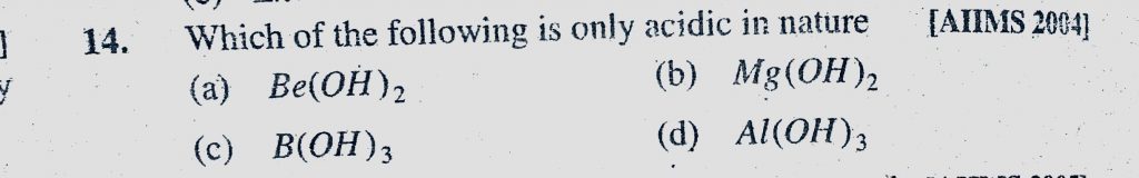 Which of the following is only acidic in nature (a) Be(OH)2 (b) Mg(OH)2 (c) B(OH)3 (d) Al(OH)3 Which of the following is only acidic in nature (a) Be(OH)2 (b) Mg(OH)2 (c) B(OH)3 (d) Al(OH)3 November 17, 2020 Category: Uncategorised (JEE Advanced Physics by BM Sharma + GMP Solutions) , Facebook Messenger WhatsApp Share this:TwitterFacebook Related