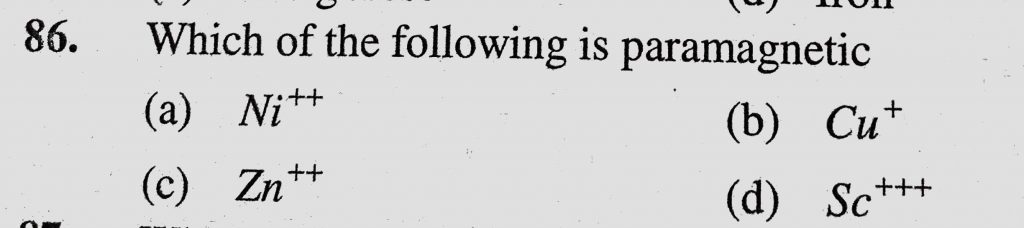 Which of the following is paramagnetic (a) Ni ++ (b) Cu + (c) Zn ++ (d) Sc +++ Which of the following is paramagnetic (a) Ni ++ (b) Cu + (c) Zn ++ (d) Sc +++ November 30, 2020 Category: Uncategorised (JEE Advanced Physics by BM Sharma + GMP Solutions) , Facebook Messenger WhatsApp Share this:TwitterFacebook Related