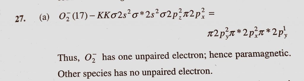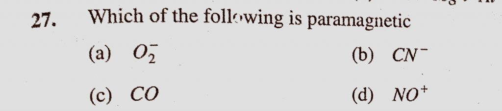 Which of the following is paramagnetic (a) O2- (b) CN- (c) CO (d) NO + Which of the following is paramagnetic (a) O2- (b) CN- (c) CO (d) NO + November 10, 2020 Category: Uncategorised (JEE Advanced Physics by BM Sharma + GMP Solutions) , Facebook Messenger WhatsApp Share this:TwitterFacebook Related