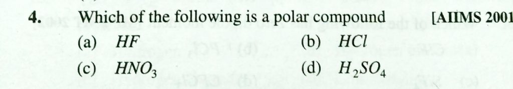 Which of the following is polar compound (a) HF (b) HCL (c) HNO3 (d) H2SO4 Which of the following is polar compound (a) HF (b) HCL (c) HNO3 (d) H2SO4 December 2, 2020 Category: Uncategorised (JEE Advanced Physics by BM Sharma + GMP Solutions) , Facebook Messenger WhatsApp Share this:TwitterFacebook Related