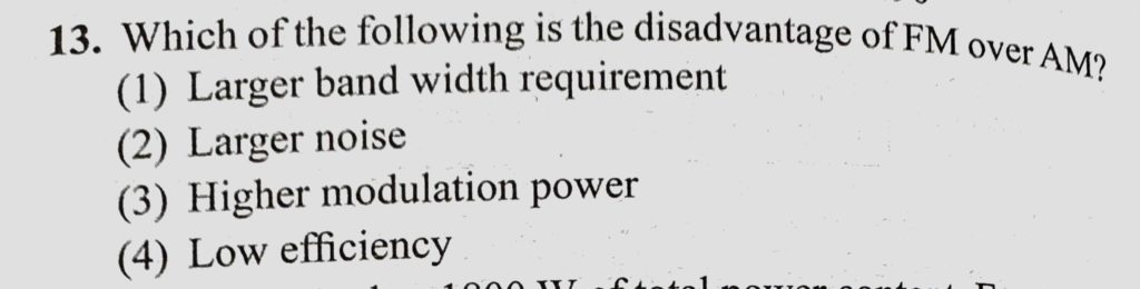 Which of the following is the disadvantage of FM over AM ? (1) Larger band width requirement (2) Larger noise (3) Higher modulation power Which of the following is the disadvantage of FM over AM ? (1) Larger band width requirement (2) Larger noise (3) Higher modulation power October 22, 2020 Category: Uncategorised (JEE Advanced Physics by BM Sharma + GMP Solutions) , Facebook Messenger WhatsApp Share this:TwitterFacebook Related