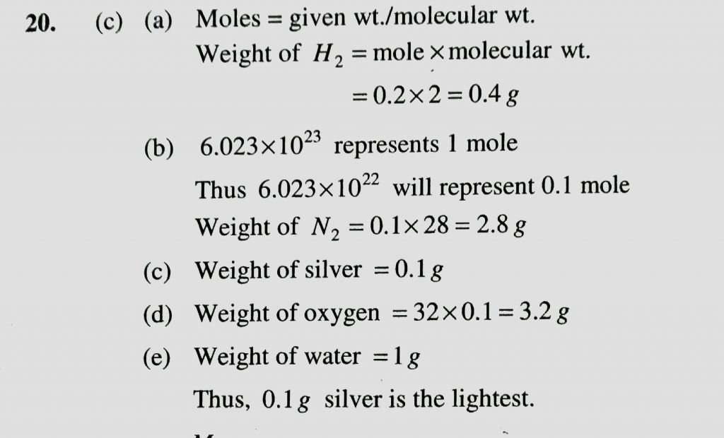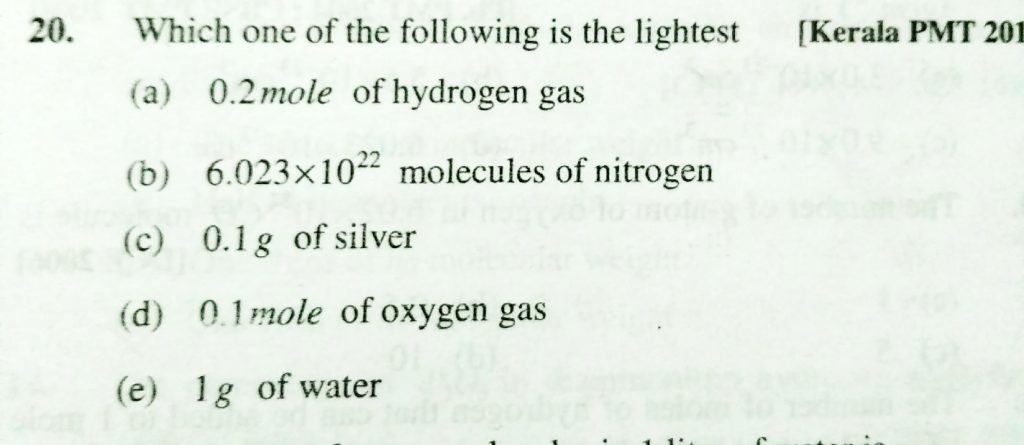 Which of the following is the lightest (a) 0.2 mole of hydrogen gas (b) 6.023 x 10^22 ,olecules of nitrogen (c) 1.0 g of silver (d) 0.1 mole of oxygen gas (e) 1 g of water olecules of nitrogen (c) 1.0 g of silver (d) 0.1 mole of oxygen gas (e) 1 g of water Which of the following is the lightest (a) 0.2 mole of hydrogen gas (b) 6.023 x 10^22 November 22, 2020 Category: Uncategorised (JEE Advanced Physics by BM Sharma + GMP Solutions) , Facebook Messenger WhatsApp Share this:TwitterFacebook Related