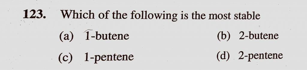 Which of the following is the most stable (a) 1-butene (b) 2-butene (c) 1-pentene (d) 2-pentene Which of the following is the most stable (a) 1-butene (b) 2-butene (c) 1-pentene (d) 2-pentene December 14, 2020 Category: Uncategorised (JEE Advanced Physics by BM Sharma + GMP Solutions) , Facebook Messenger WhatsApp Share this:TwitterFacebook Related