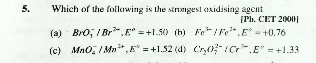 Which of the following is the strongest oxidising agent (a) BrO3 ^- /Br^2+ , E0 = 1.50 E0 = 1.50 Which of the following is the strongest oxidising agent (a) BrO3 ^- /Br^2+ November 24, 2020 Category: Uncategorised (JEE Advanced Physics by BM Sharma + GMP Solutions) , Facebook Messenger WhatsApp Share this:TwitterFacebook Related