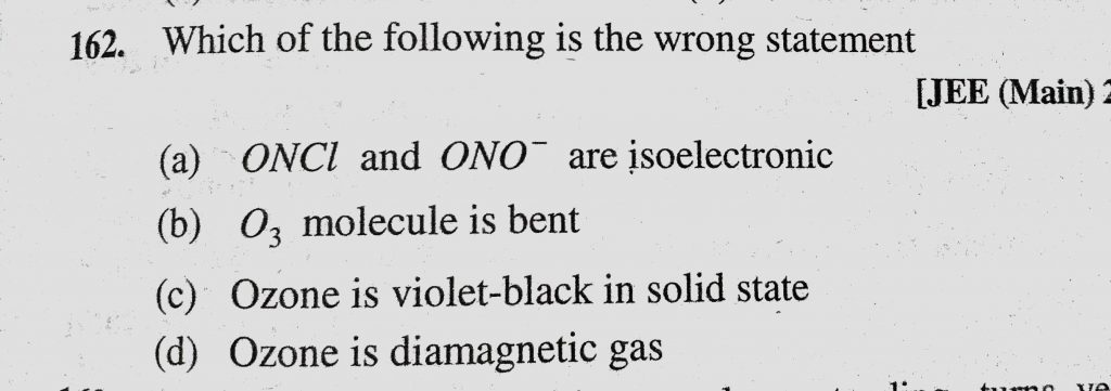 Which of the following is the wrong statement (a) ONCl and ONO- are isoelectronic (b) O3 molecule is bent (c) Ozone is voilet-black in solid state Which of the following is the wrong statement (a) ONCl and ONO- are isoelectronic (b) O3 molecule is bent (c) Ozone is voilet-black in solid state November 28, 2020 Category: Uncategorised (JEE Advanced Physics by BM Sharma + GMP Solutions) , Facebook Messenger WhatsApp Share this:TwitterFacebook Related