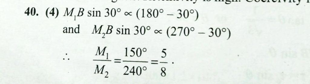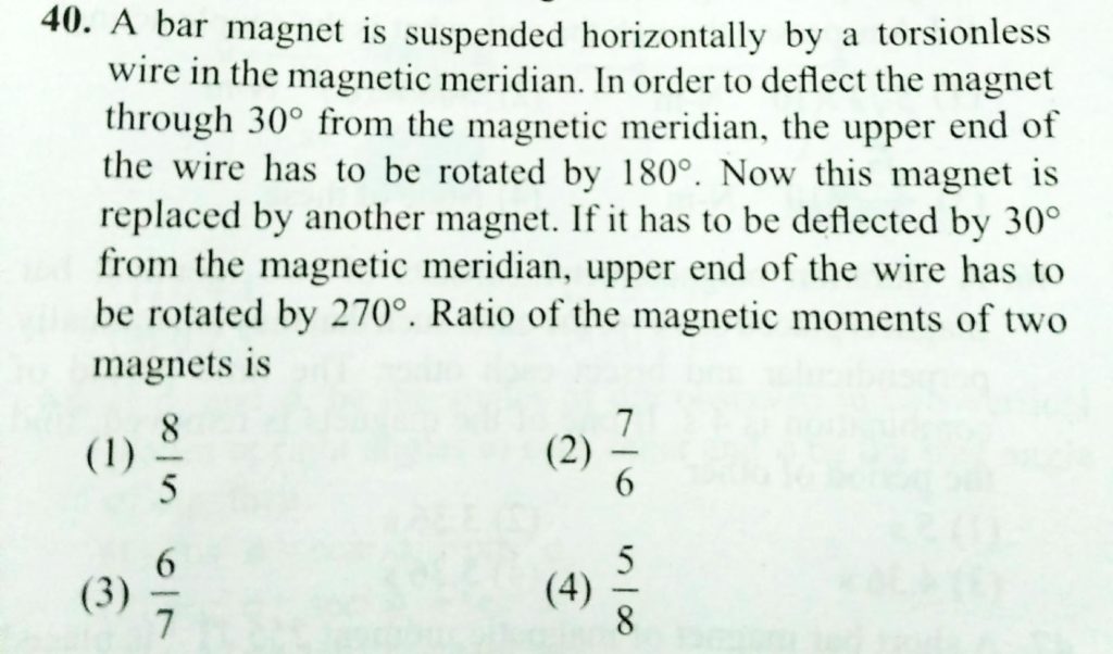 A magnet is suspended in the magnetic meridian with an untwisted wire. The upper end of wire is rotated through 180∘ to deflect the magnet by 30∘ from magnetic meridian. When this magnet is replaced by another magnet, the upper end of wire is rotated through 270∘ to deflect the magnet 30∘ from magnetic meridian. The ratio of magnetic moment of magnets is