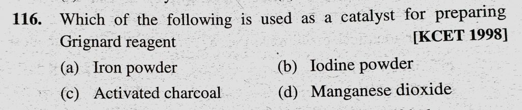 Which of the following is used as a catalyst for preparing Grignard reagent (a) Iron powder (b) Iodine powder (c) Activated charcoal (d) Manganese dioxide Which of the following is used as a catalyst for preparing Grignard reagent (a) Iron powder (b) Iodine powder (c) Activated charcoal (d) Manganese dioxide February 8, 2021 Category: Uncategorised (JEE Advanced Physics by BM Sharma + GMP Solutions) , Facebook Messenger WhatsApp Share this:TwitterFacebook Related