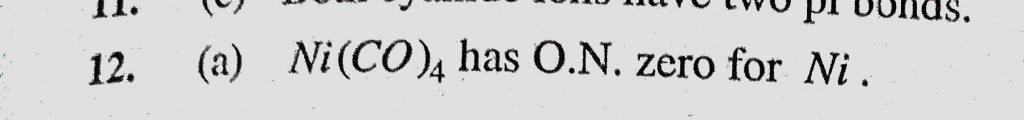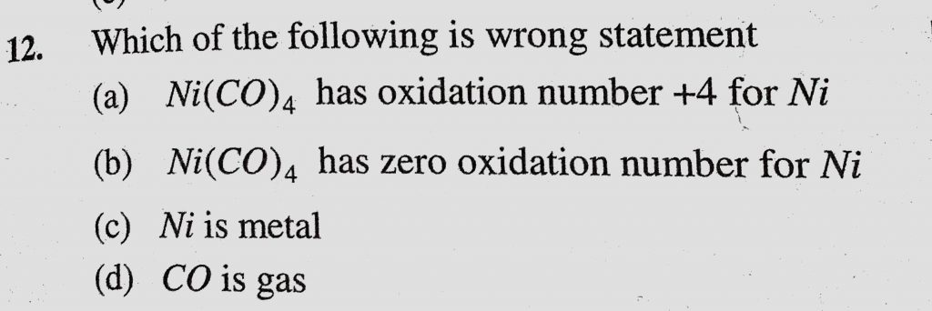 Which of the following is wrong statement (a) Ni(CO)4 has oxidation number +4 for Ni (b) NI(CO)4 has zero oxidation number for Ni Which of the following is wrong statement (a) Ni(CO)4 has oxidation number +4 for Ni (b) NI(CO)4 has zero oxidation number for Ni December 3, 2020 Category: Uncategorised (JEE Advanced Physics by BM Sharma + GMP Solutions) , Facebook Messenger WhatsApp Share this:TwitterFacebook Related