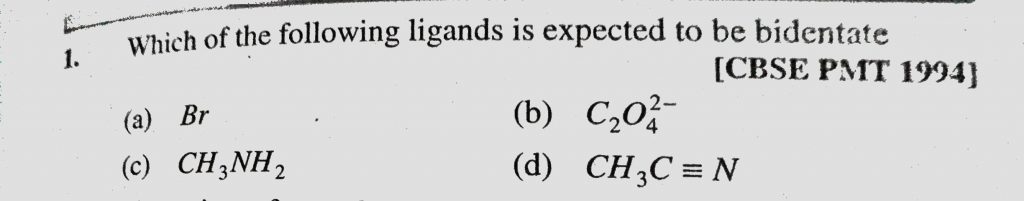 Which of the following ligands is expected to be bidenate (a) Br (b) C2O4 2- (c) CH3NH2 Which of the following ligands is expected to be bidenate (a) Br (b) C2O4 2- (c) CH3NH2 December 3, 2020 Category: Uncategorised (JEE Advanced Physics by BM Sharma + GMP Solutions) , Facebook Messenger WhatsApp Share this:TwitterFacebook Related